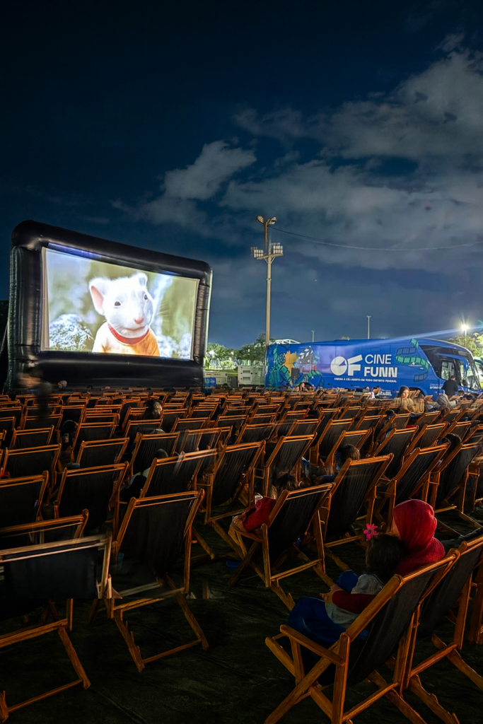 À noite, a programação é dedicada às sessões gratuitas de cinema ao ar livre, com exibição de filmes nacionais e internacionais. O público ainda recebe pipoca e refrigerante gratuitamente, transformando o espaço em um ambiente de lazer, encontro e acesso democrático à cultura para toda a família.